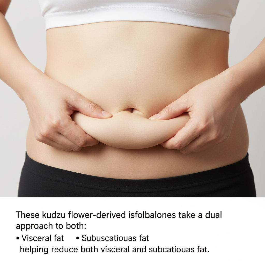 Die Kudzu-Blüten-Isoflavone von Onaka verfolgen einen doppelten Ansatz und richten sich sowohl gegen das viszerale Fett (um die Organe) als auch gegen das Unterhautfett (unter der Haut). Im Gegensatz zu Nahrungsergänzungsmitteln, die nur das Wassergewicht ansprechen, wirkt Onaka auf die tatsächlichen Fettdepots am Bauch durch wissenschaftlich belegte Mechanismen.