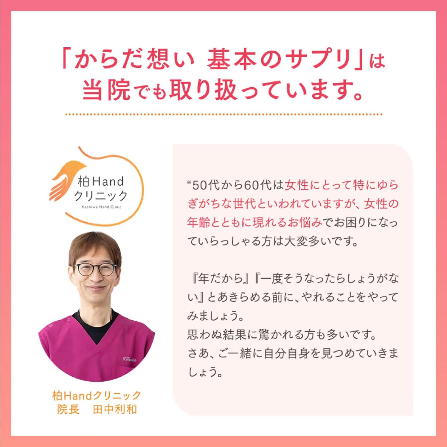 Empfehlung durch medizinische Fachkräfte—Dr. Toshikazu Tanaka von der Kashiwa-Handklinik empfiehlt das Produkt für Frauen in ihren 50ern und 60ern, die hormonelle Schwankungen erleben.