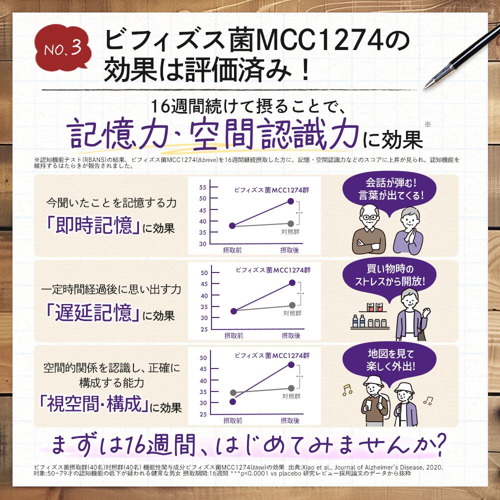 Világszínvonalú Eredmények—Az MCC1274 a világ első olyan egyetlen bifidobaktérium törzse, amelyről közzétett kutatások igazolják az emlékezet megőrzését, és Japán első bifidobaktérium alapú, kognitív támogatást nyújtó funkcionális élelmiszere.