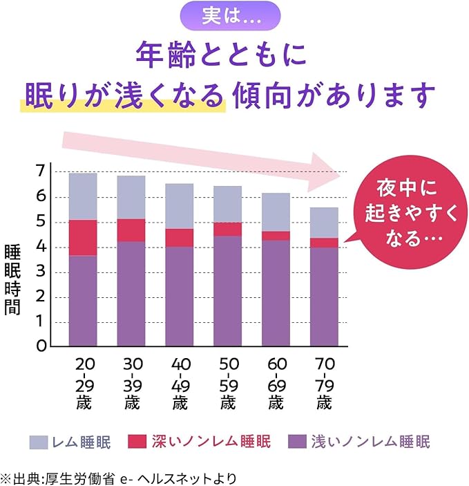 Életkorral összefüggő alvásmintázat-változások—Adatok a Japán Egészségügyi Minisztériumtól, amelyek azt mutatják, hogy az életkor előrehaladtával a mélyalvás csökken, míg a könnyű alvás nő, ami éjszakai középidőben történő ébredések gyakoribbá válását eredményezi.