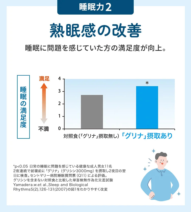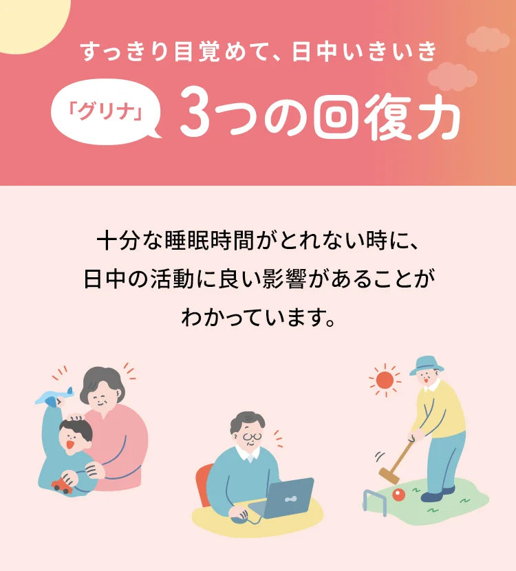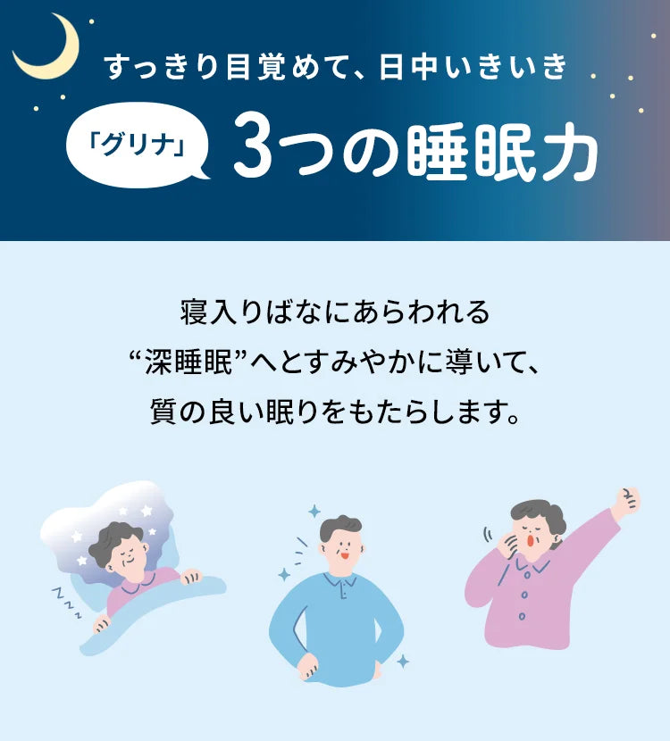 Glyna è stato il supplemento per il sostegno del sonno numero 1 in Giappone per 12 anni consecutivi (ricerca di mercato Fuji Keizai). Oltre 2,83 milioni di clienti hanno usato Glyna, e l'85% degli utenti intervistati riferisce di averne avvertito i benefici.