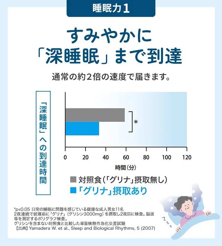 Accelerazione del Sonno Profondo—I test con polisomnografia hanno mostrato che la glicina ha aiutato a raggiungere il sonno profondo circa 2 volte più rapidamente rispetto al controllo (p<0,05). Yamadera W et al., Sonno e Ritmi Biologici, 2007.