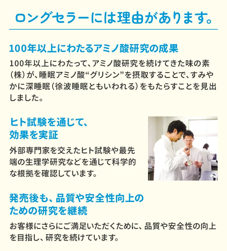 Ajinomoto ha sviluppato questo dosaggio basandosi sulle proprie ricerche che dimostrano che è la quantità efficace per raggiungere il sonno profondo più rapidamente e migliorare la qualità del sonno.