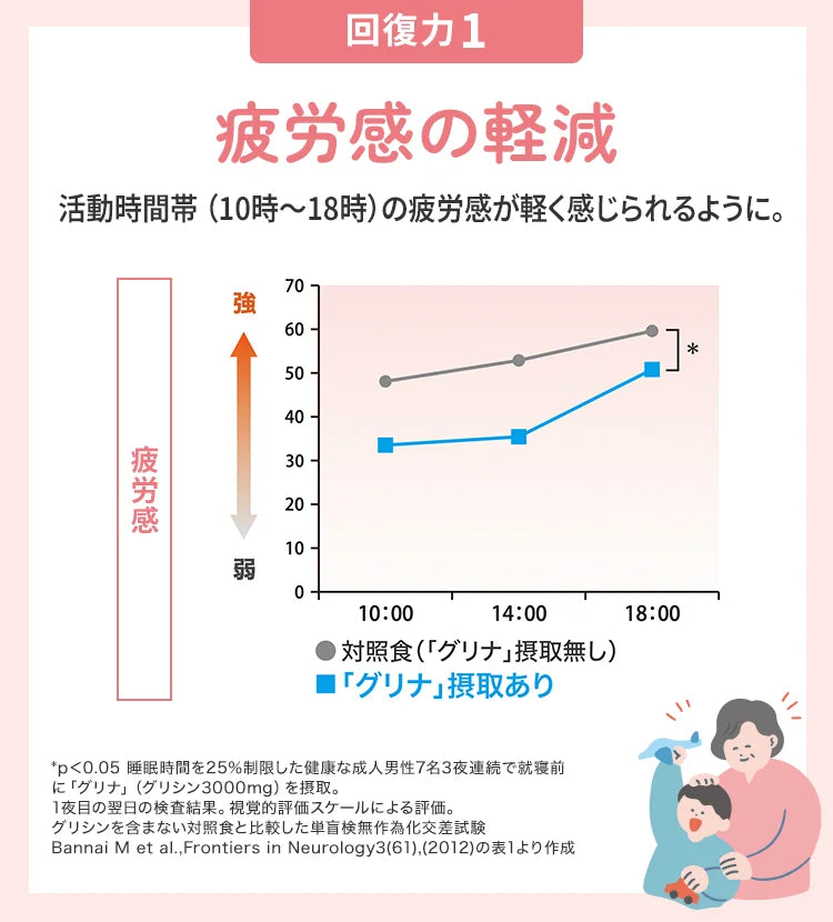 Studio sulla Riduzione della Stanchezza—Uno studio in doppio cieco ha mostrato una significativa riduzione dei punteggi di affaticamento durante le ore attive (dalle 10 alle 18) nel gruppo trattato con glicina rispetto al placebo (p<0,05). Bannai M et al., Frontiers in Neurology, 2012.