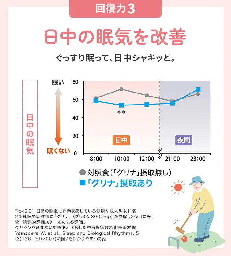 La glicina è l'amminoacido più semplice, presente naturalmente in alimenti come capesante e pesce. Ajinomoto ha scoperto che un'integrazione di glicina (3000 mg) aiuta il corpo a raggiungere il sonno profondo più rapidamente, migliorando la qualità complessiva del riposo e il recupero del giorno seguente.