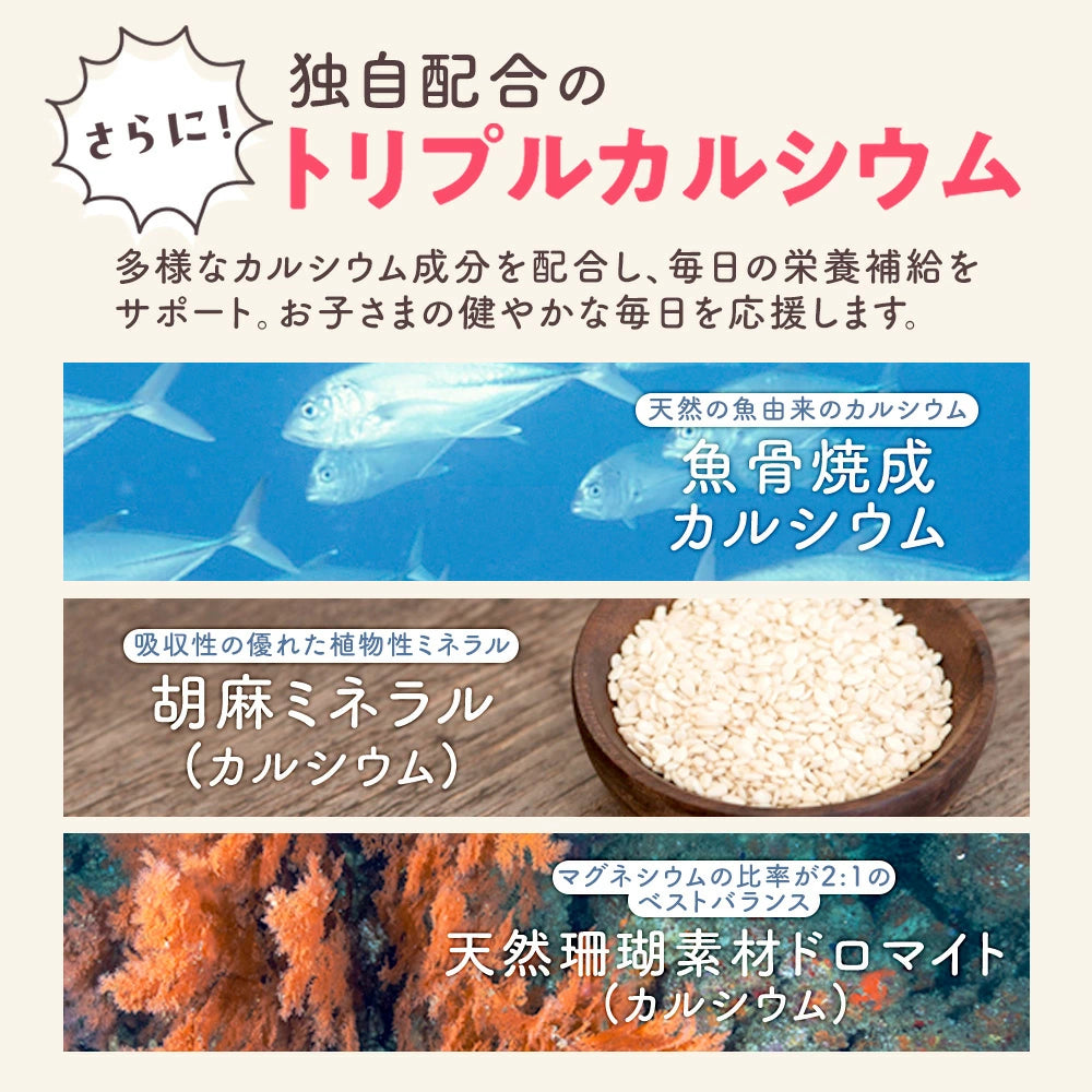 Il sistema Triplo Calcio fornisce calcio da tre fonti (ossa di pesce, minerali di sesamo e dolomite) con magnesio in un rapporto ottimale di 2:1. La vitamina D (76% del fabbisogno giornaliero) e il CPP migliorano l'assorbimento del calcio per ossa e denti in crescita.
