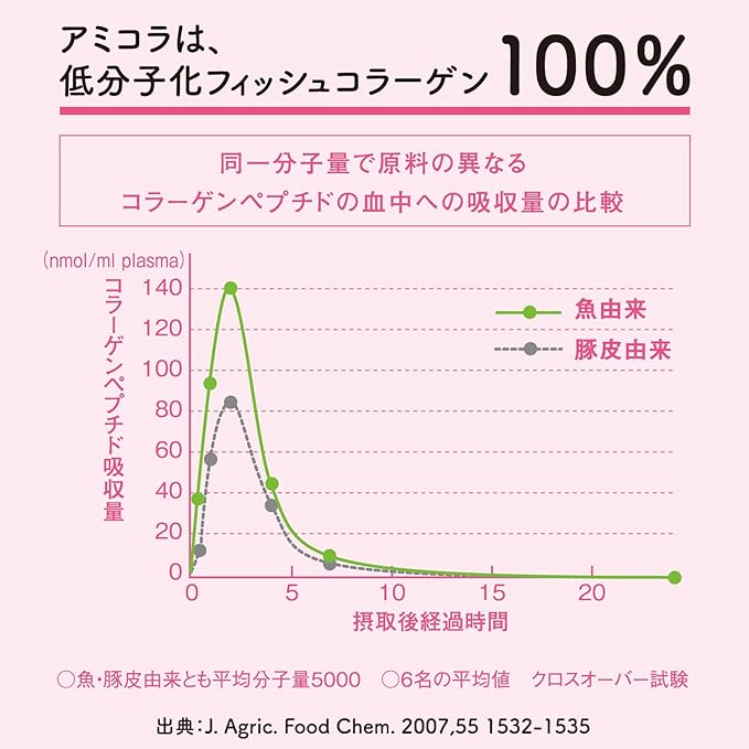 Studio sull'assorbimento del collagene di pesce—Uno studio incrociato che ha confrontato peptidi di collagene derivati da pesce e dalla pelle di maiale (entrambi con peso molecolare medio di 5.000) ha misurato i livelli di assorbimento nel sangue in 6 soggetti. Il collagene derivato dal pesce ha raggiunto concentrazioni di peptidi di collagene nel sangue circa 1,5 volte superiori. Pubblicato su: J. Agric. Food Chem. 2007, 55, 1532-1535