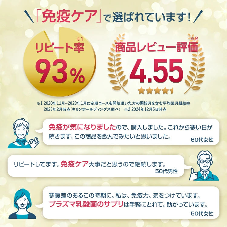 Recensioni dei consumatori e tasso di riacquisto—Il prodotto mantiene un tasso di riacquisto del 93% (misurato tra gli inizi di abbonamento da novembre 2020 a gennaio 2023) e una valutazione di 4,55 nelle recensioni (a dicembre 2024). Le testimonianze dei clienti, utenti tra i 50 e i 60 anni, sottolineano la comodità e la tranquillità della cura quotidiana del sistema immunitario con il Lactobacillus Plasma.