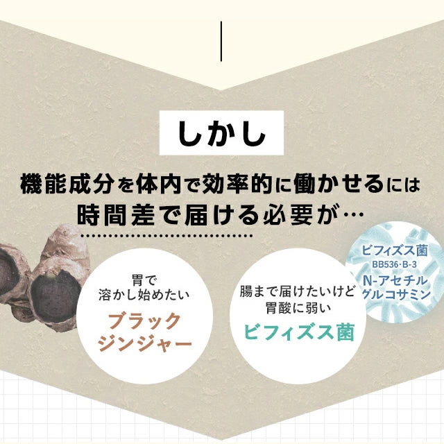 Teknologi Halangan & Pelepasan milik FANCL melindungi probiotik daripada asid perut sambil menyampaikan Halia Hitam ke tempat ia berfungsi dengan terbaik.