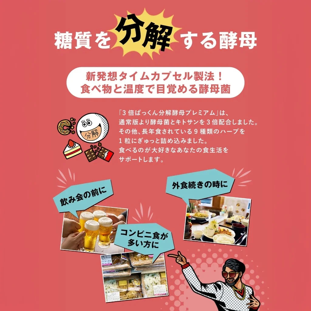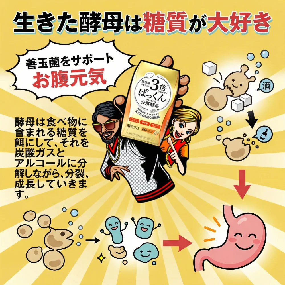 Yis tersebut akan bangun apabila terdedah kepada makanan dan suhu badan, memastikan ia aktif apabila sampai ke sistem pencernaan anda. Versi unggul ini juga mengandungi 3 kali ganda yis dan chitosan berbanding Pakkun biasa.