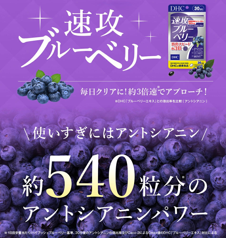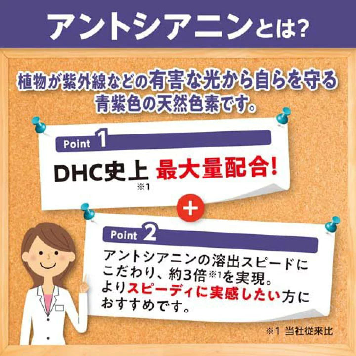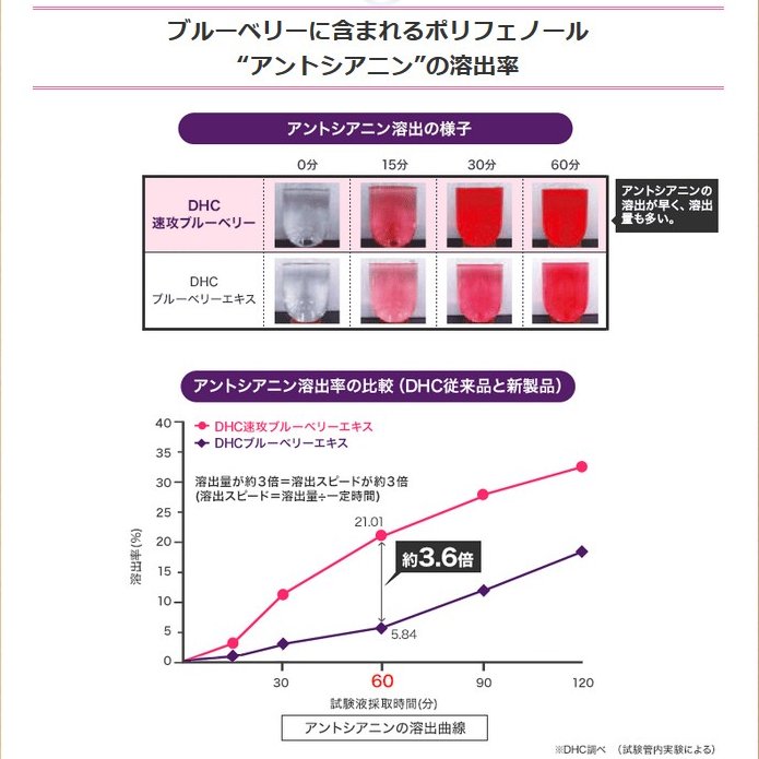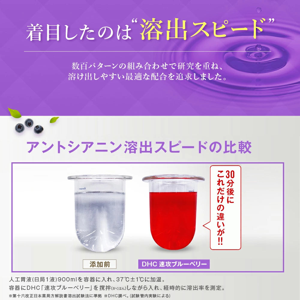 DHC'nin özel hızlı çözünme teknolojisi, geleneksel takviyelere kıyasla antosiyanin salınımını 3 kat daha hızlı gerçekleştirerek daha çabuk sonuçlar sağlar.