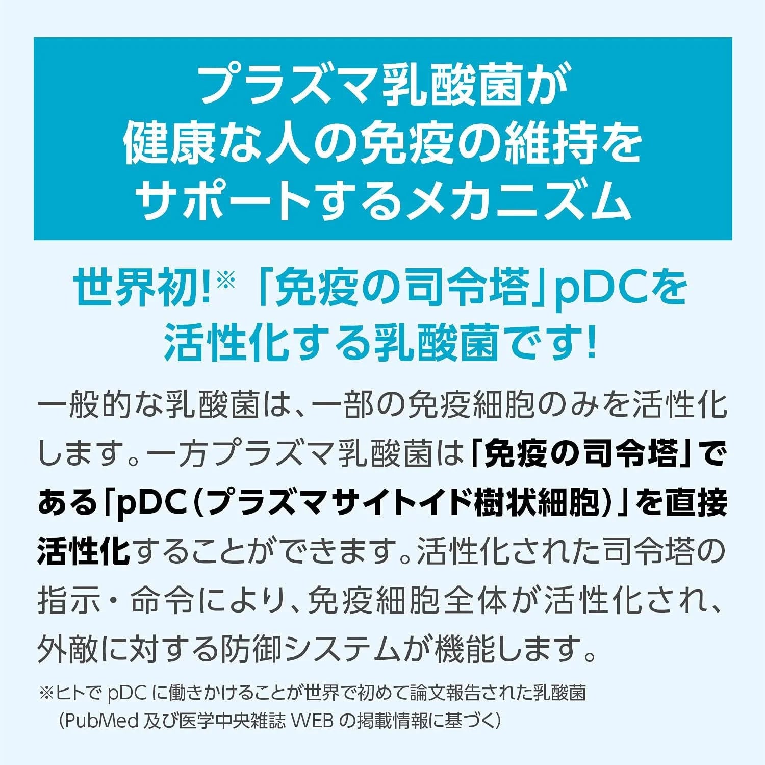 Dünyada Bir İlk Bilimsel Keşif—Plazma Laktik Asit Bakterileri, insanlarda pDC'yi etkinleştirdiği bilimsel literatürde bildirilen ilk probiyotiktir. PubMed ve Japon Tıp Özetleri Derneği veri tabanında belgelenmiştir.