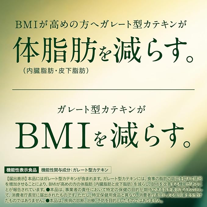 政府登記的功能性聲明—已向日本消費者廳登記為功能性標示食品(H49)。官方聲明確認沒食子酸酯兒茶素能透過抑制飲食脂肪吸收,減少體脂肪並改善身體質量指數(BMI)。